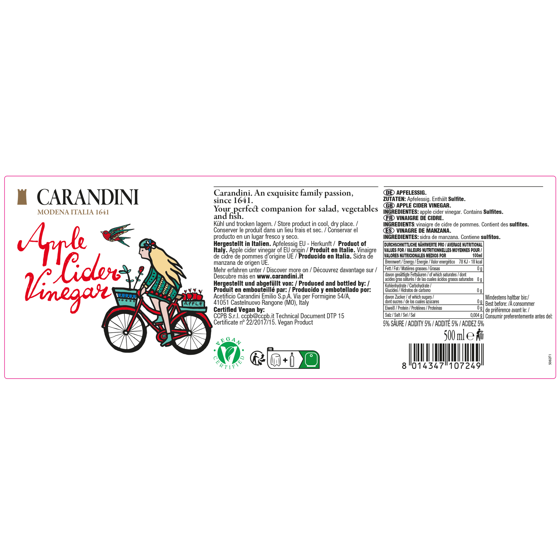 L’Aceto di Mele Carandini è delicato, fresco e dall’aroma equilibrato.