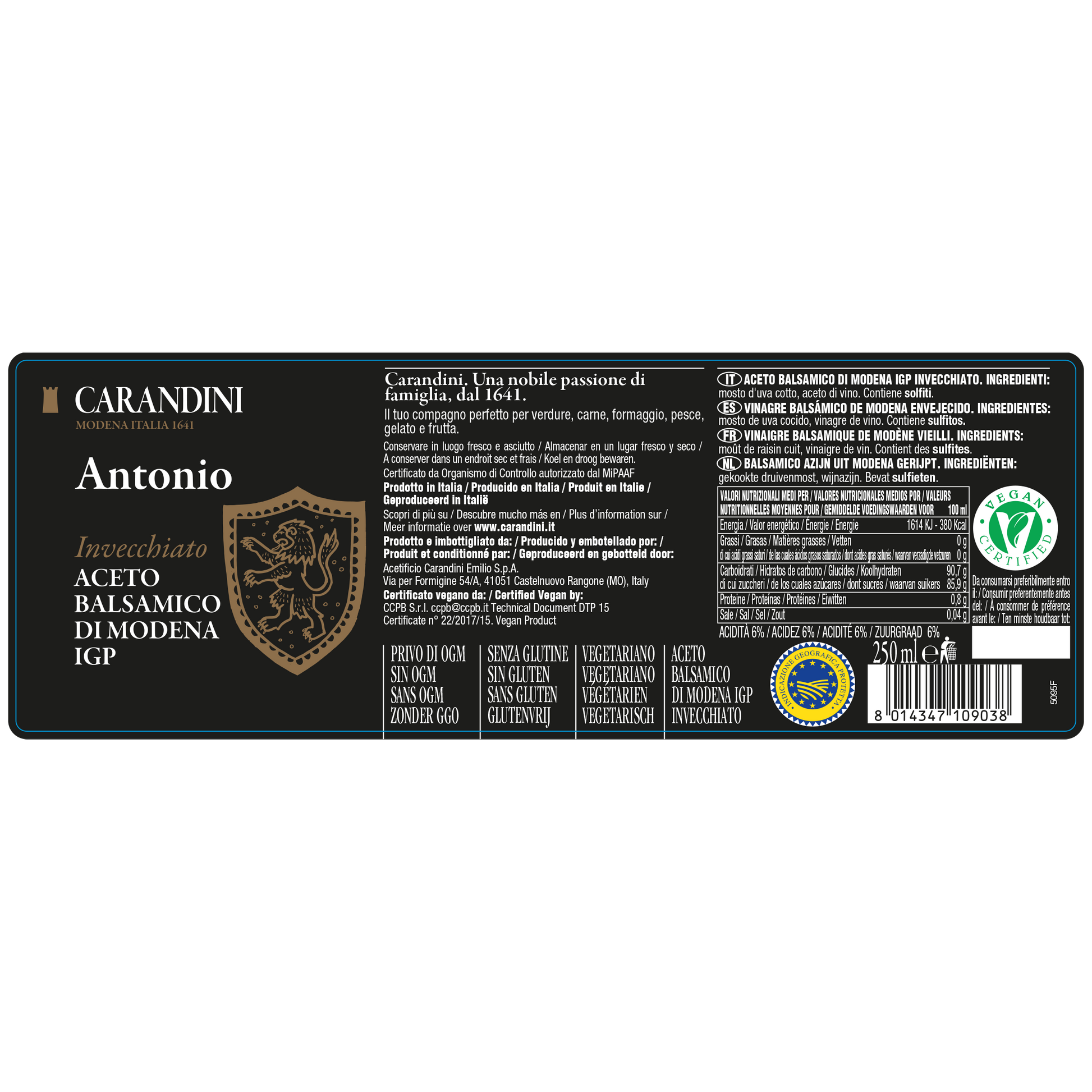 L’Aceto Balsamico di Modena IGP Invecchiato Antonio prende il nome dal più antico discendente dei Carandini a cui gli archivi di Famiglia fanno riferimento per la grandi abilità nell’arte della produzione di Aceto Balsamico di Modena.