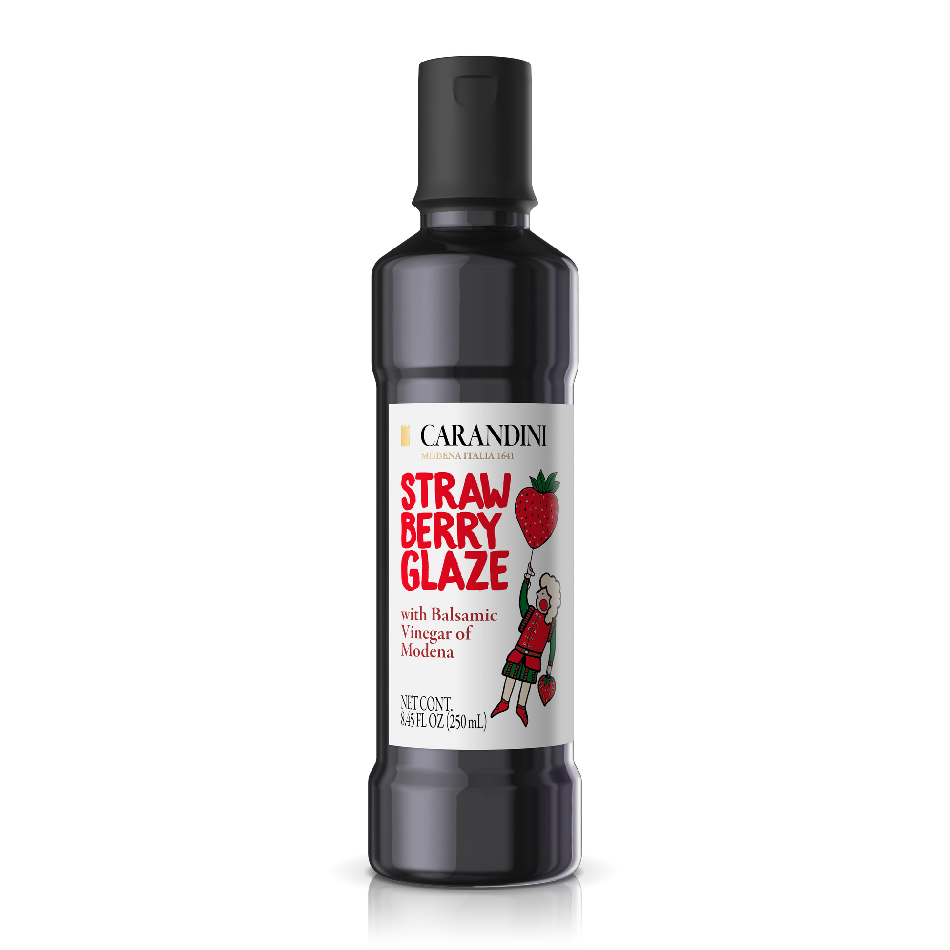 La Glassa Carandini all’Aceto Balsamico di Modena IGP al gusto Fragola contiene Aceto Balsamico di Modena IGP, mosto concentrato e di aroma di Fragola.