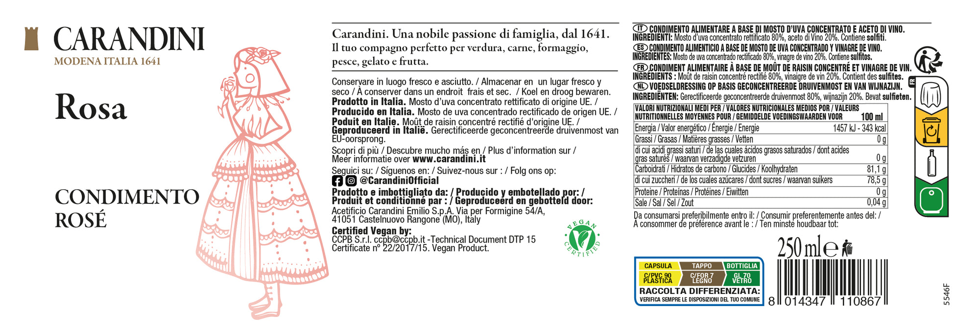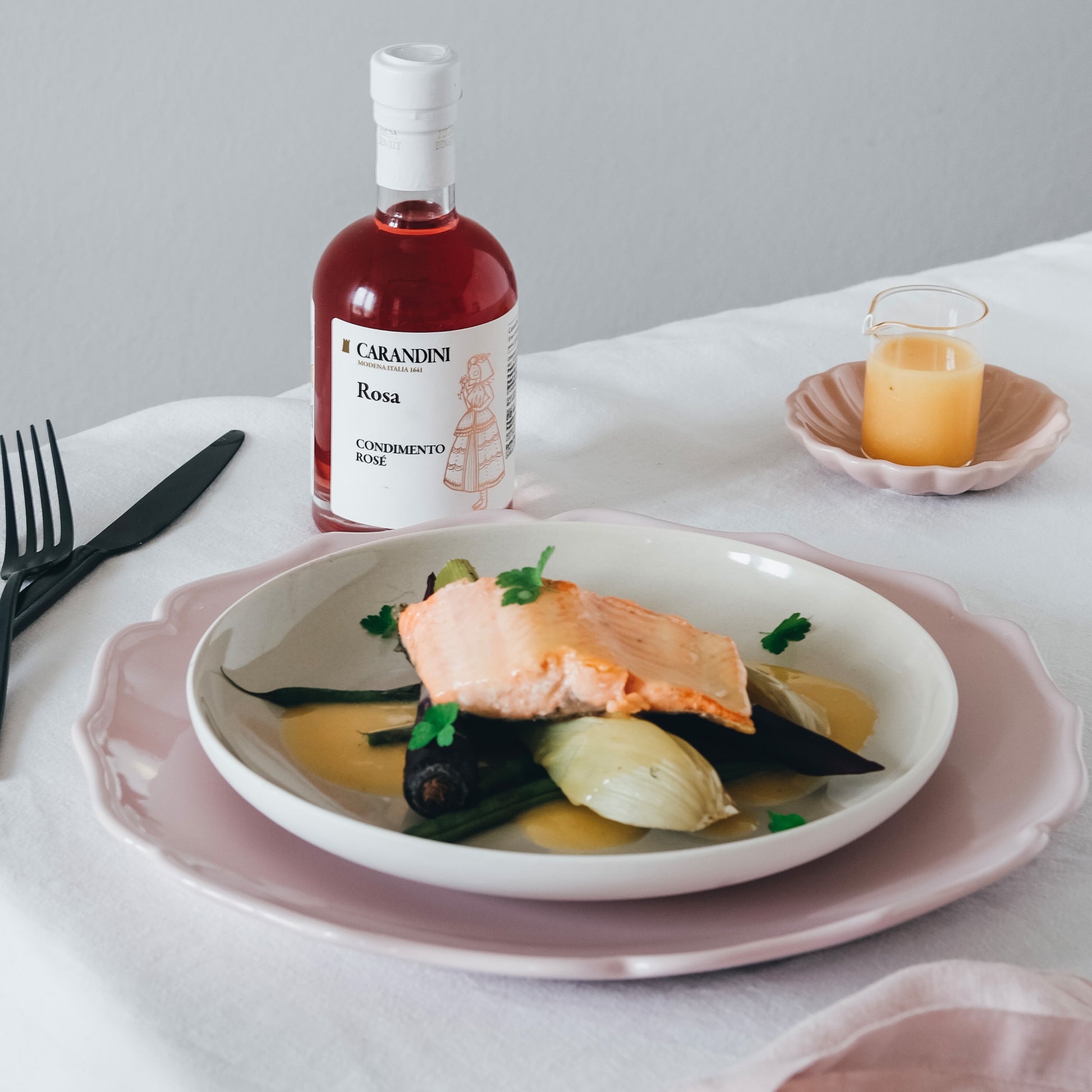 Delicato, frizzante e raffinato, è Rosa, il nuovo Condimento Rosé di Carandini. Estremamente versatile, deve la sua dolcezza al mosto concentrato e quella nota frizzantina all'aceto di vino. È un condimento ideale per verdure, carne e pesce. Meraviglioso nelle bevande e nella frutta.